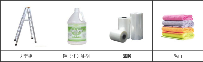 人字梯、除(化)油剂、毛刷、垫布、白洁布、毛巾、薄膜、纯棉白手套(薄)。