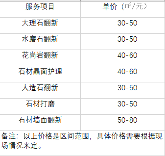 由于决定石材护理价格的因素较多,比如:石材安装工艺如何?石材剪口大不大,也就是高低大不大等。还有与石材材质有很大关系,同时也要看石材的材质和石材的目前一个状况来决定石材翻新的价格。因此价格要看实际现场才知道价格,以下给根据石材材质情况,给出的价格参考。